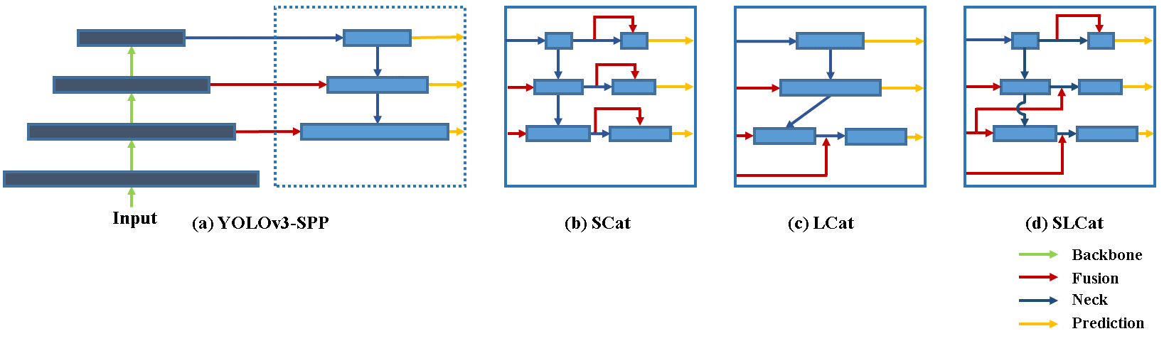 - YOLOv3 기반하여 특징 이어붙이기(concatenation)을 3가지 형태로 추가 적용하여 작은 물체들의 특징 정보 보존