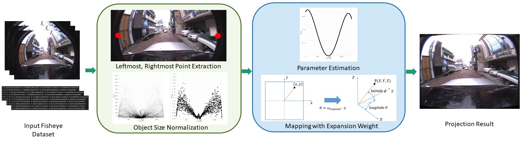 - 대용량 데이터셋 구축을 위해 일반 카메라용 오픈 소스 데이터셋 KITTI와 CityScape을 어안 카메라 모델을 활용하여 영상 합성