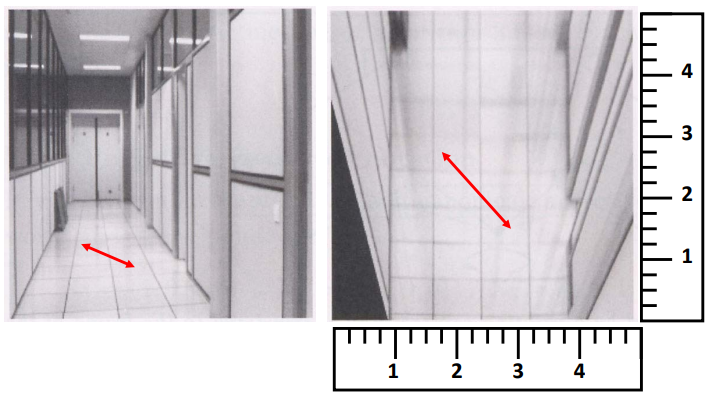 Figure 2. 평행선을 갖고 있는 타일 Figure 2의 왼쪽 그림에서는 실제 세계에서는 평행한 선들을 갖고 있는 타일이 나타나 있습니다. 타일 사이의 대각선 길이를 찾고자 할 때, 왼쪽 그림에 바닥에 놓인 선들이 평행으로 놓여지도록 시점을 가상으로 바꾼 다음, 오른쪽 그림처럼 측정할 수 있습니다.