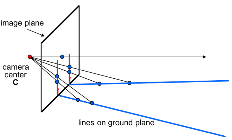 Figure 5. 평행한 선들을 영상에 투영 line on the ground plane에 위치하는 파란색 점들이 image plane으로 투영될 때 점점 vanishing point로 수렴하는 걸 볼 수 있습니다. 현재는 광학축 (camera 좌표계에서 z축)이 평면의 파란색 선과 평행하기 때문에, 광학축이 영상 평면과 교차되는 점으로 vanishing point가 나타납니다.