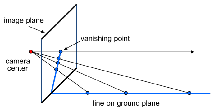 카메라의 광학축이 바닥 부분과 평행한다고 했을 때 영상에서 평행한 선들은 물리적 세계에서는 한 점에서 출발해서 점점 사이 거리 멀어지는, 발산하는 선들이다.