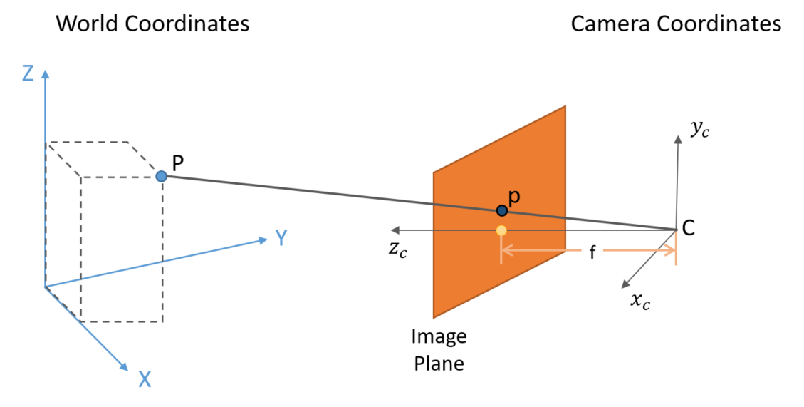 카메라 좌표계(Camera Coordinate) 는 중심 C를 기준으로 $x_c, y_c, z_c$ 3개의 축으로 이루어져 있으며, 영상과 카메라 중점 사이는 초점거리 f로 나타나 있습니다.