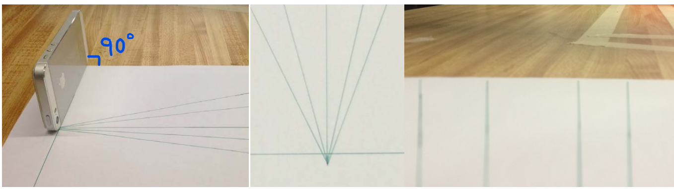 Figure 7. 영상에서 평행한 선들 확인하는 방법 먼저 한 점에서 점점 발산하는 선들을 줄 자를 그립니다. 그 다음 폰 카메라를 평평한 바닥에 90도로 세워서 위치하고 휴대폰을 앞 뒤로 움직이면 특정 위치에서, 선들이 영상 안에 평행하게 나타나 확인할 수 있고, 그 특정 위치와 점 사이 거리를 초점 거리로 볼 수 있습니다. 이 부분은 추후에 더 다뤄보도록 하겠습니다.