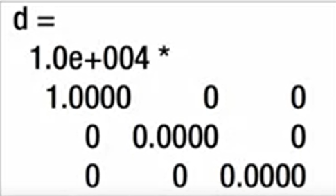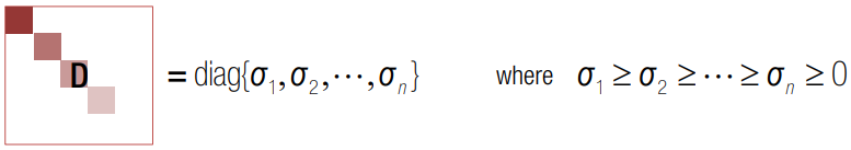 그리고 D는 대각선 행렬이라해서, 빨간색으로 위치한 것처럼 대각선 위치의 값들 빼고는 모든 값이 0인 행렬입니다. 이 D 행렬의 대각성분은 AtA 혹은 AAt의 고유값들에 루트를 씌워준 값으로 구성되어 있고, 이 값을 행렬 A의 특이값이라고 합니다.