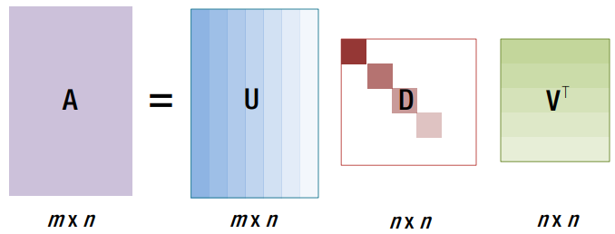SVD 특이값 분해는 mxn의 행렬 A를 mxn의 U 행렬, nxn의 D 행렬, nxn의 Vt (V의 전치행렬)로 분해하는 과정을 말합니다.